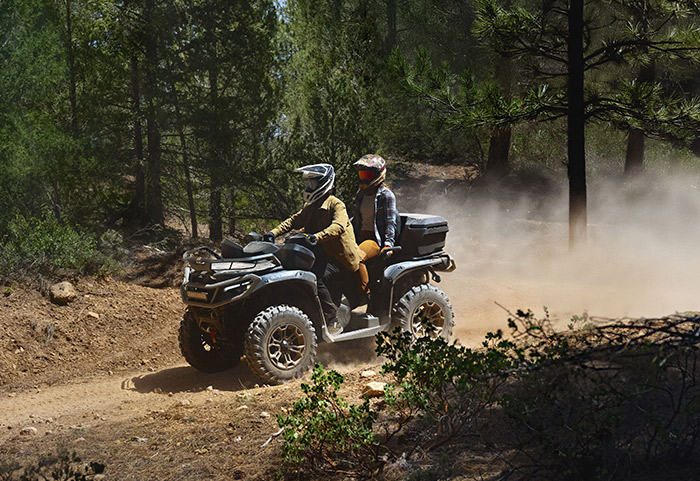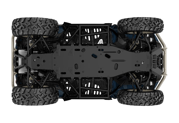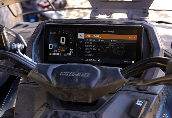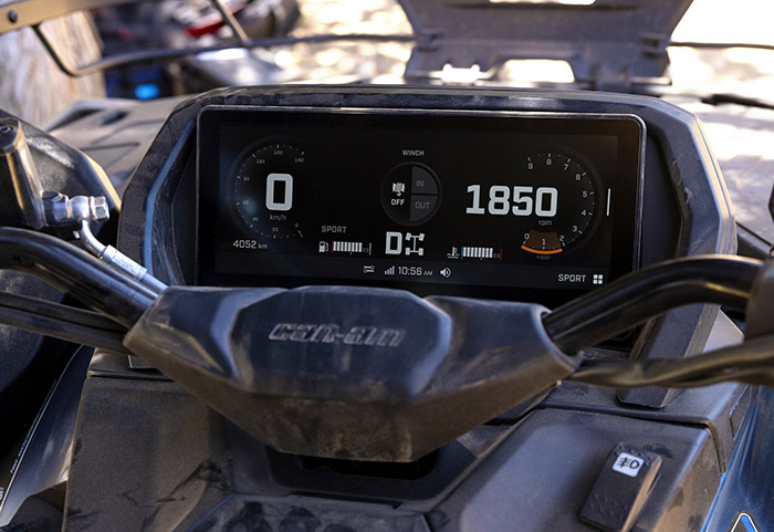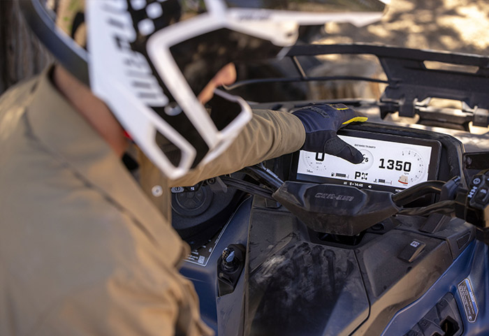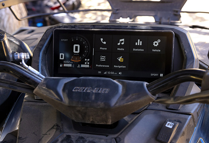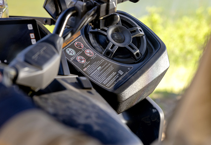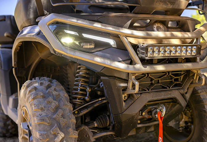 Equipado com amortecedores dianteiros e traseiro Fox 1.5 Podium QS3, direção dinâmica assistida de modo triplo (DPS), guincho com capacidade para 1.588 kg (3.500 lb), diferencial dianteiro autoblocante Visco-4Lok, para-choques dianteiros e traseiros reforçados, rodas de alumínio fundido de 14 polegadas com pneus Maxxis Bighorn 2.0 de 27 polegadas, defletores de vento no guidão, mostrador digital multifunção de 7,6 polegadas e muito mais.